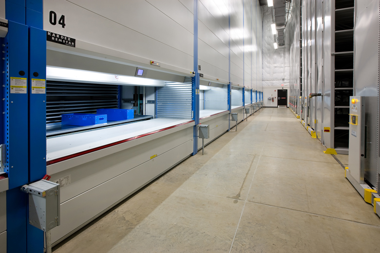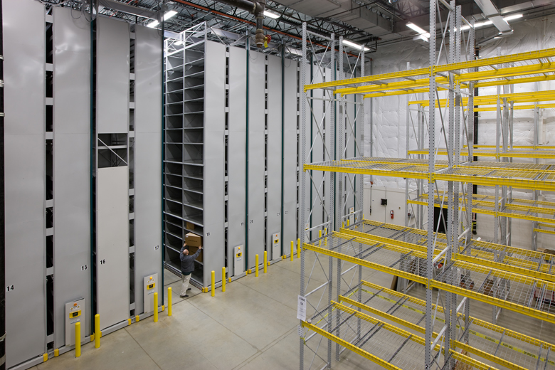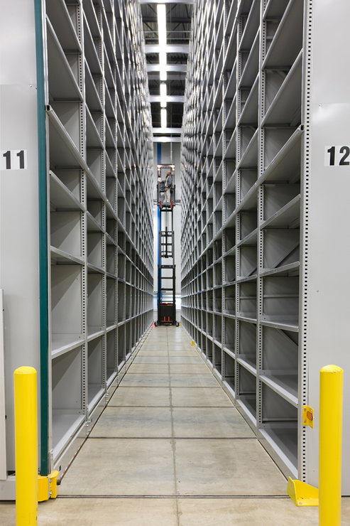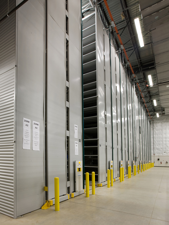 This facility was designed for extremely dense storage of police evidence using two types of storage equipment: