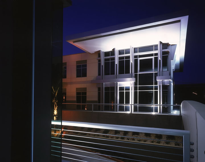 Vaulted roof overhands, craftsman-like metal detailing and a concrete framed bridge serve as the special focus near the automobile entry. The central autocourt links each building with a curvilinear gesture culminating in rounded entry lobbies and the subtle use of curvilinear paving patterns, soffits and arches are blended to weave a harmonious complex with the hillside location. Each lobby features a two-story rotunda, intricately soffitted translucent skylights and upgraded finish materials.