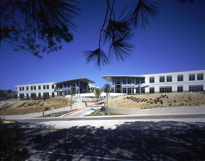 Another unique requirement imposed by the Coastal Commission regulations was a 30-foot maximum height limit for buildings. This meant that the 120,000 square feet of office space, which is sectioned into three 40,000-square-foot buildings, had to be designed as a two-story structure. Such low-rise structures raise concerns for corporate clients desiring visibility and site prominence.