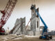 Construir los paneles a temperaturas bajo cero presentó algunos retos pero Concrete Strategies tenía las soluciones. Las cuadrillas usaron sopletes de gas propano para derretir el hielo de los cimientos lo que permitió colocar los paneles y rellenar los insertos de elevación con anticongelante RV para mantenerlos libres de hielo y nieve. Se soltaron los paneles congelados a las losas de vaciado usando cuñas y puntales. Los paneles finales que forman una torre impresionante se construyeron el 23 de febrero de 2015.