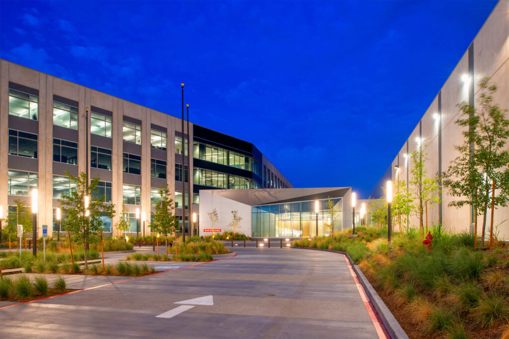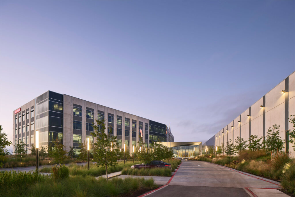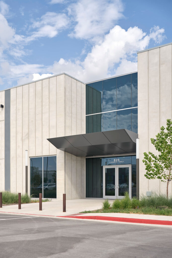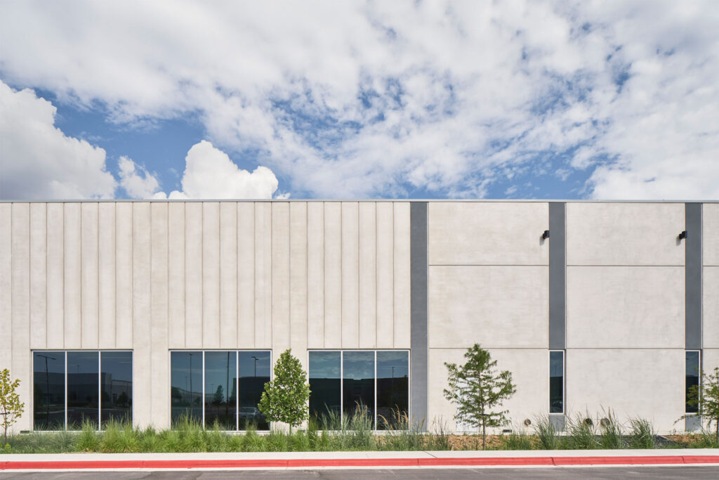 The manufacturing building employed a contrasting enclosure approach. Although single-story, its wall panels approached the height of the adjacent office structure, creating extended expanses of concrete along one of the campus’s primary internal vehicular routes. Early exploration of surface patterning through formliners proved ineffective at this scale, as the panel height diminished the impact of applied texture. In response, a system of vertical reveals formed directly through wood formwork was developed. This strategy introduced depth and articulation, reinforced vertical proportion across the long horizontal façade, and avoided alignment and tolerance issues often associated with large-scale formliner applications. All reveals were designed within structural tolerances, simplifying formwork and pre-pour preparation while maintaining consistency across the enclosure system.
