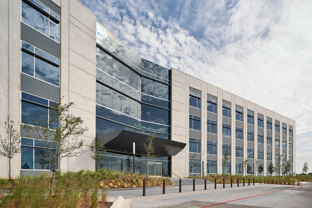 Wall panel design responded directly to the project’s dual program requirements through two distinct enclosure strategies. The four-story office building incorporated panels with wide vertical openings to accommodate glazing at each level. Corners of the structure were intentionally left open, allowing curtain wall systems to infill two elevations. This approach increased daylight penetration and provided expansive views across the Parker campus toward downtown Austin, while maintaining structural continuity.