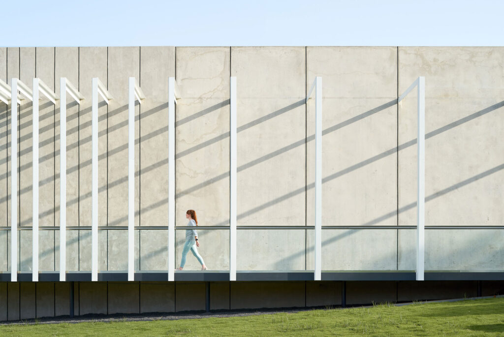Tilt-up concrete panels formed the primary structural system and the dominant architectural expression. The panels performed multiple roles simultaneously, functioning as exterior enclosure, vertical structure, and interior finish in select locations. Steel framing and glue-laminated beams spanned between panels, allowing large interior openings while maintaining structural efficiency. Window openings were minimized on the west elevation to support clinical requirements, reinforcing the logic of the program through the building envelope.