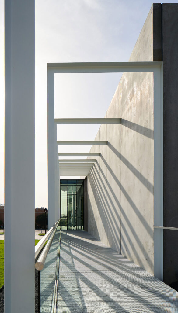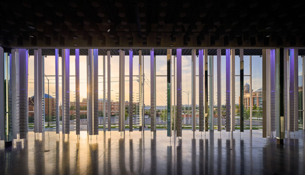 The geometry of the display supports, fabricated from steel angles, was echoed in the curtainwall detailing and along the elevated exterior walkway, creating a gradual spatial immersion as visitors approach the building. Cost efficiency was achieved through careful detailing, direct sourcing, and collaboration with local fabricators. Circular glass shelves used throughout the retail space were sourced from mass-produced glass trivets, resulting in significant cost savings without compromising design intent. Simple steel fabrications and solid-surface materials were used for transaction desks and counters, while floors were polished concrete and signage fabricated from powder-coated aluminum plate.