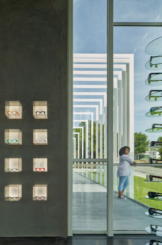 The optical sales and waiting area were expressed as a glass volume projecting from the concrete structure, allowing the interior environment to remain visually accessible and active along the street. After coordination with city staff and the adjacent residential community, the project footprint was reduced from four city lots to three. A more compact building form and an exterior elevated walkway allowed the full program to be accommodated while addressing neighborhood concerns and reducing site impact.
