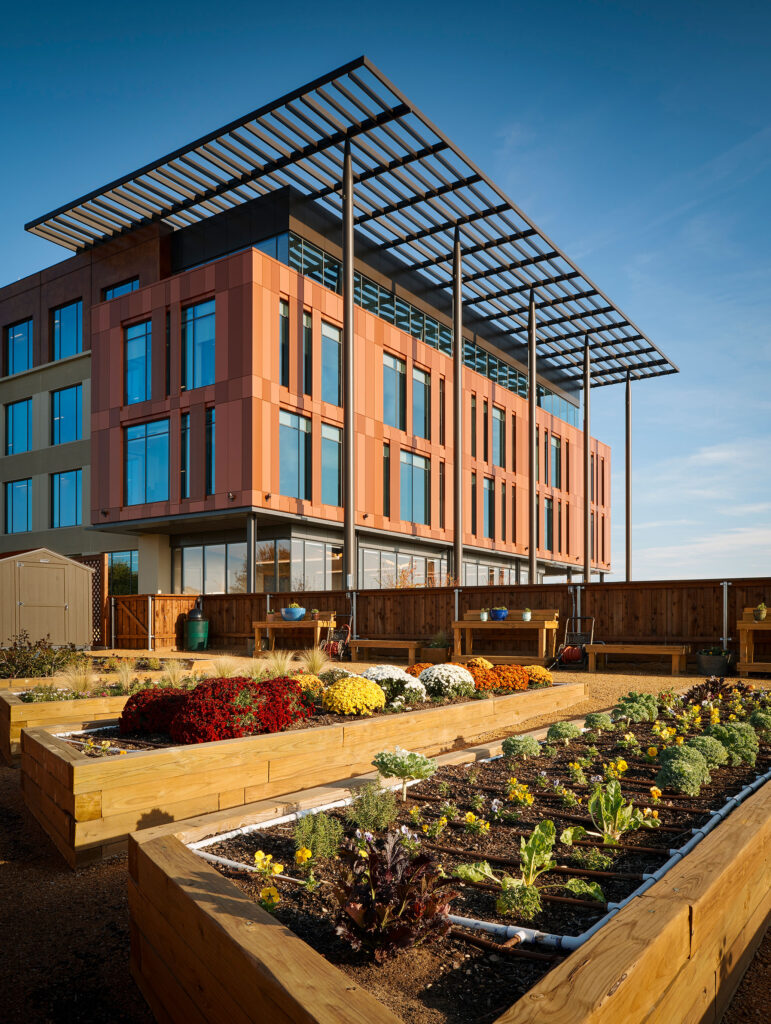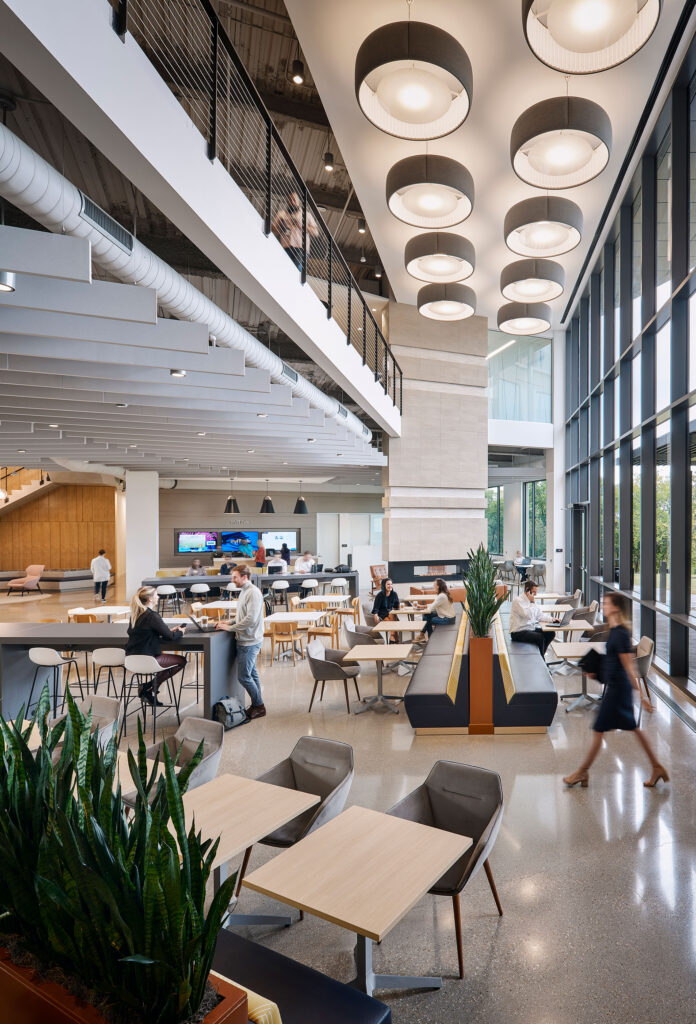 Tilt-up construction supported the project’s emphasis on indoor-outdoor continuity. Deep canopies, sun-shading devices, and wide trellis overhangs create shaded outdoor rooms and gathering areas overlooking the lake and adjacent trails. An enclosed paseo establishes view corridors from the main entry toward the water, reinforcing the building’s relationship to its landscape setting.