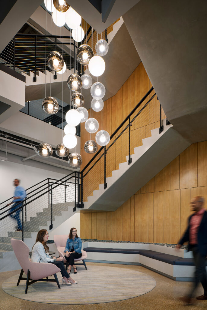 Internally, a monumental staircase extends through all four floors and functions as a central organizing element. Large glazed openings align with panel modules to frame exterior vistas, demonstrating how disciplined panel sizing can reinforce spatial intent. Post-applied interior insulation supports thermal performance objectives and contributed to LEED Silver certification. Reveals and formliner spandrels provide articulation and depth while maintaining constructability.