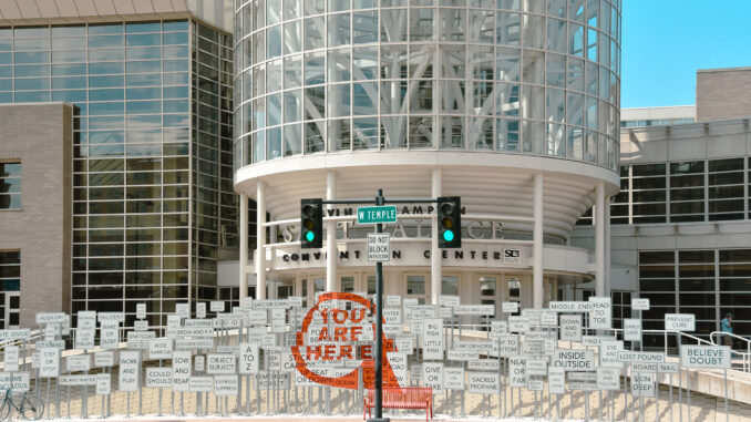 “Point of View,” a public art installation by Maine artist Aaron T. Stephan, welcomes visitors to the Salt Palace Convention Center in Salt Lake City, the future home of the 2026 Tilt-Up Convention and Expo.