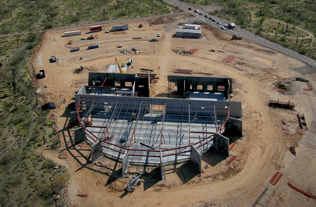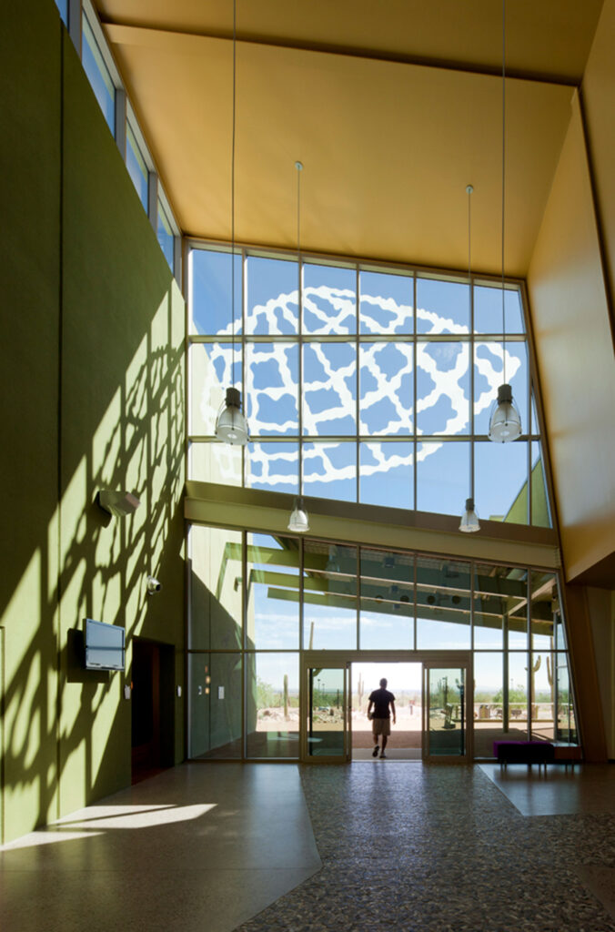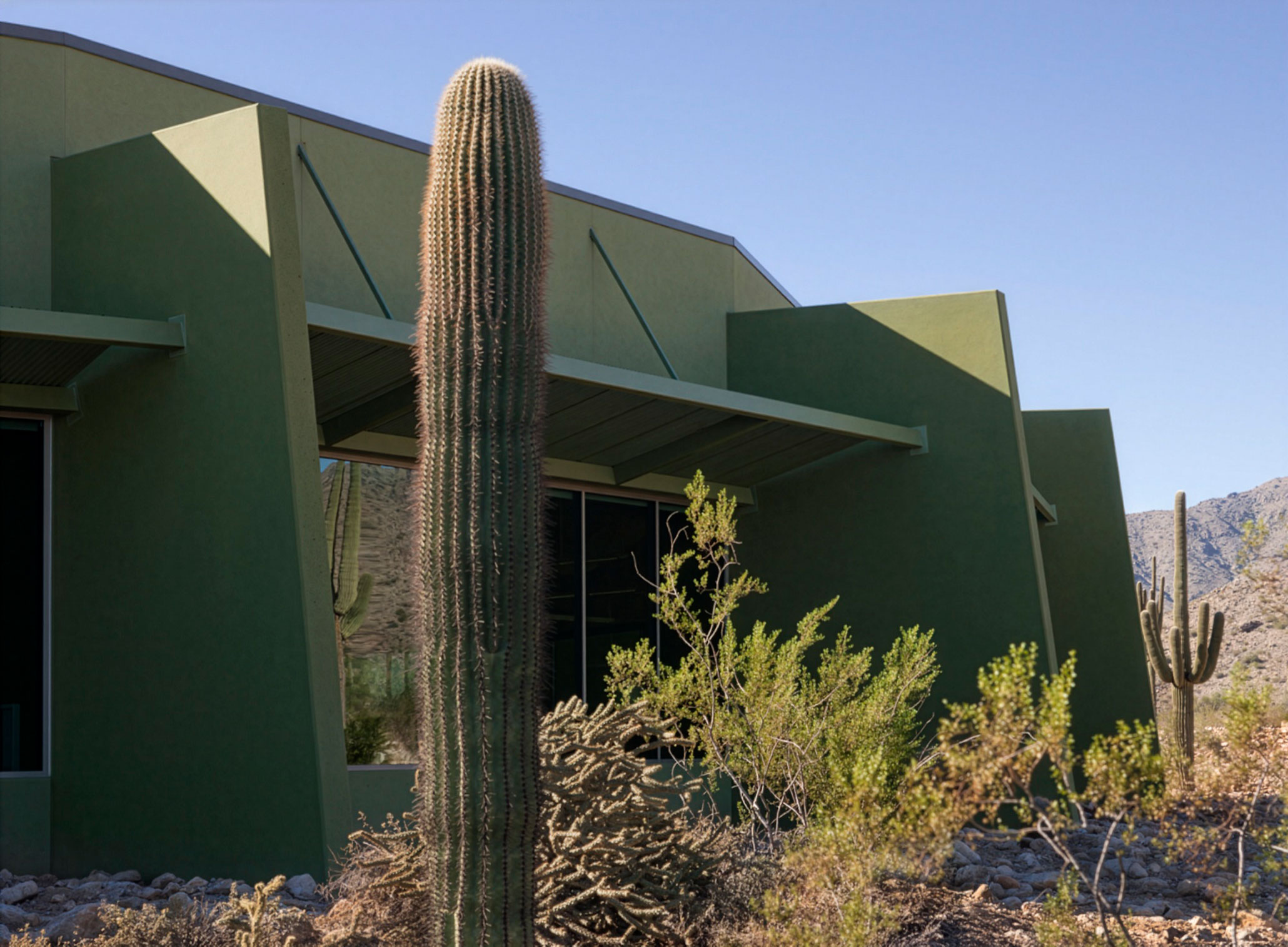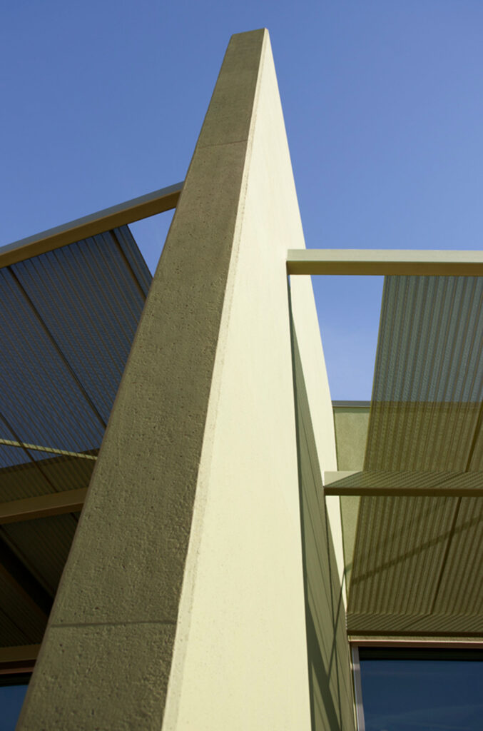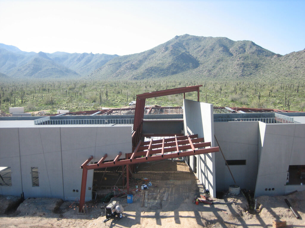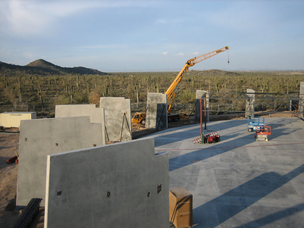 The building’s design responded directly to its surroundings, both visually and thermally. A 200-foot-long monolithic concrete wall, diagonally subdivided into abstract forms, was finished in three shades of green to align with the tones of native plant life, including saguaros, palo verdes, and mesquite trees. This approach integrated architectural expression with environmental context while maintaining the constructability advantages of tilt-up panelization.