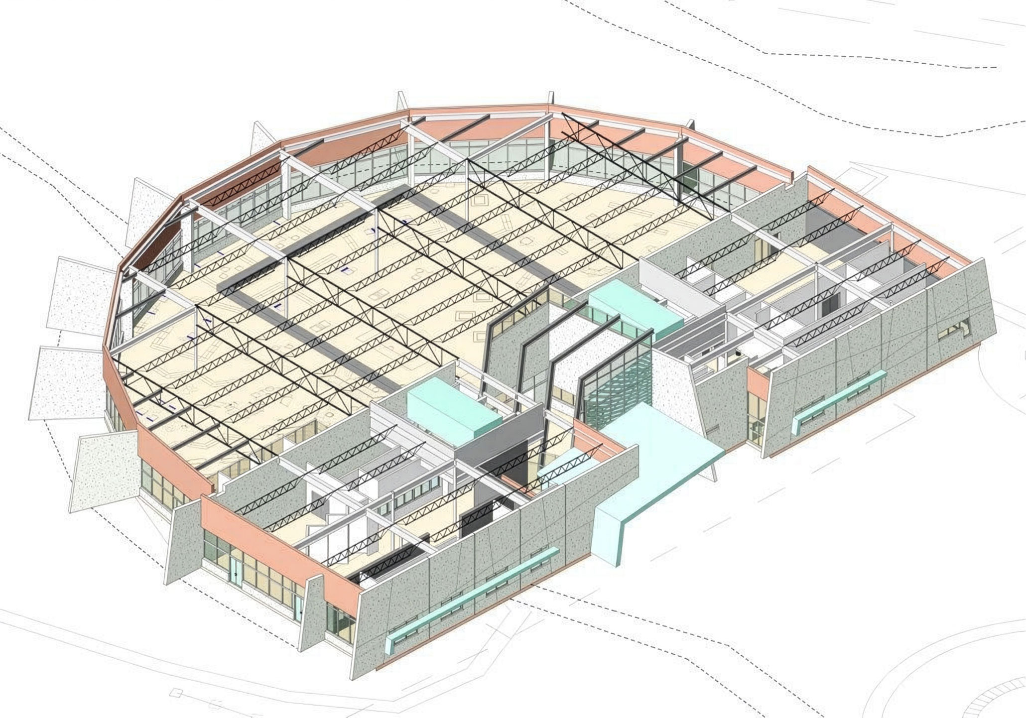 Tilt-up construction was selected in part for its economy, but the resulting wall system also played a central role in regulating interior conditions. The thick concrete panels functioned as a thermal mass, absorbing heat during peak daytime temperatures and releasing it gradually as exterior temperatures dropped. This thermal lag effect reduced fluctuations in interior temperature and lowered overall energy demand. The performance of the wall system was further enhanced through the addition of an interior liquid air barrier, framing, and batt insulation to limit heat transfer and improve envelope efficiency.