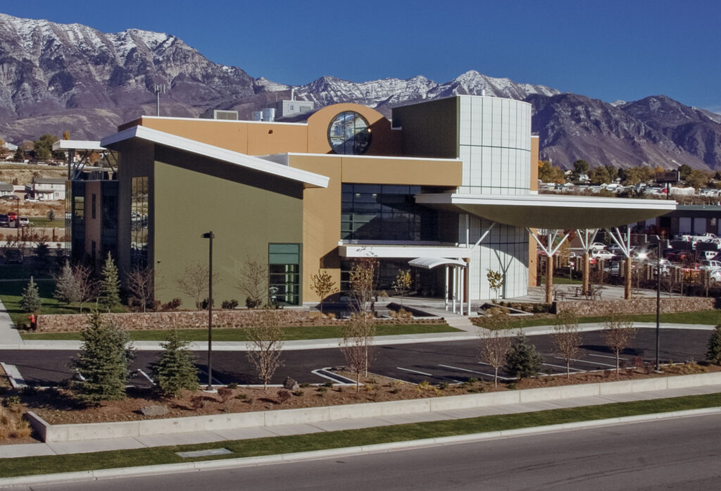 Exterior view of the Clyde Companies Corporate Office Building from the original award submittal, with the Wasatch Mountain range informing orientation, glazing, and response to light.