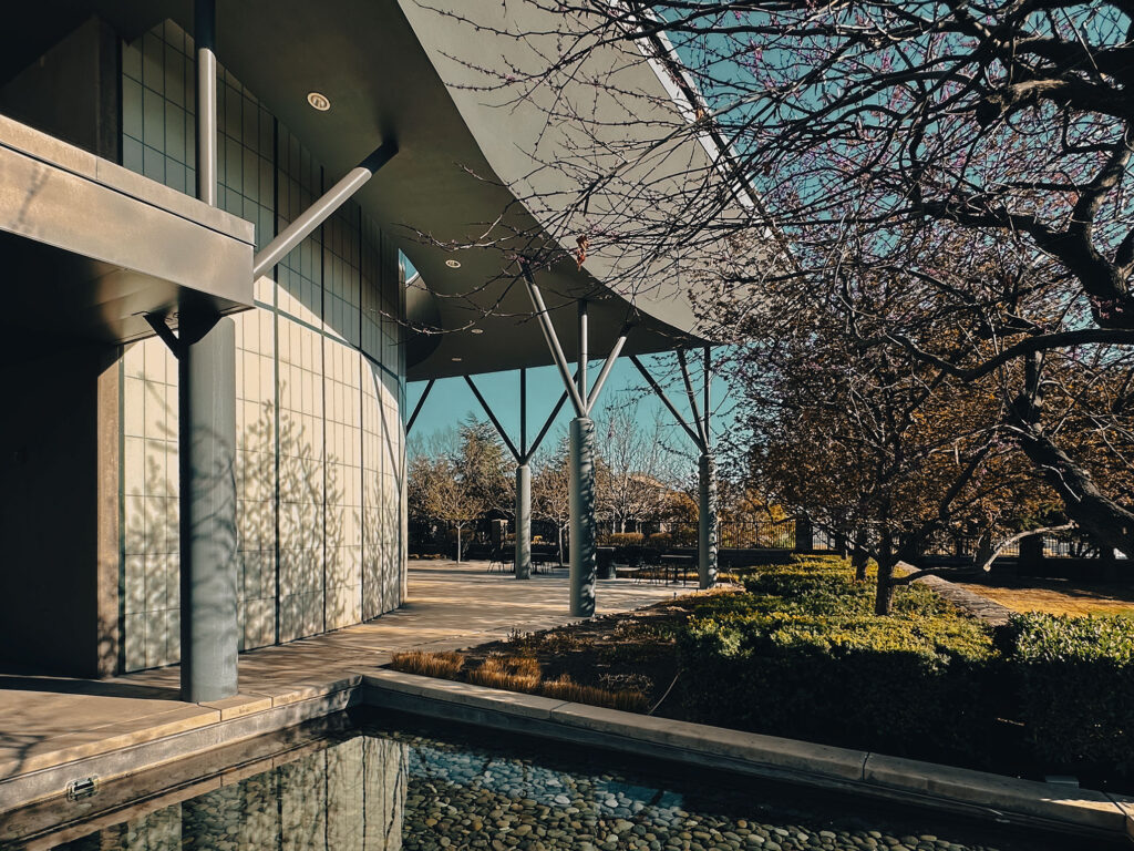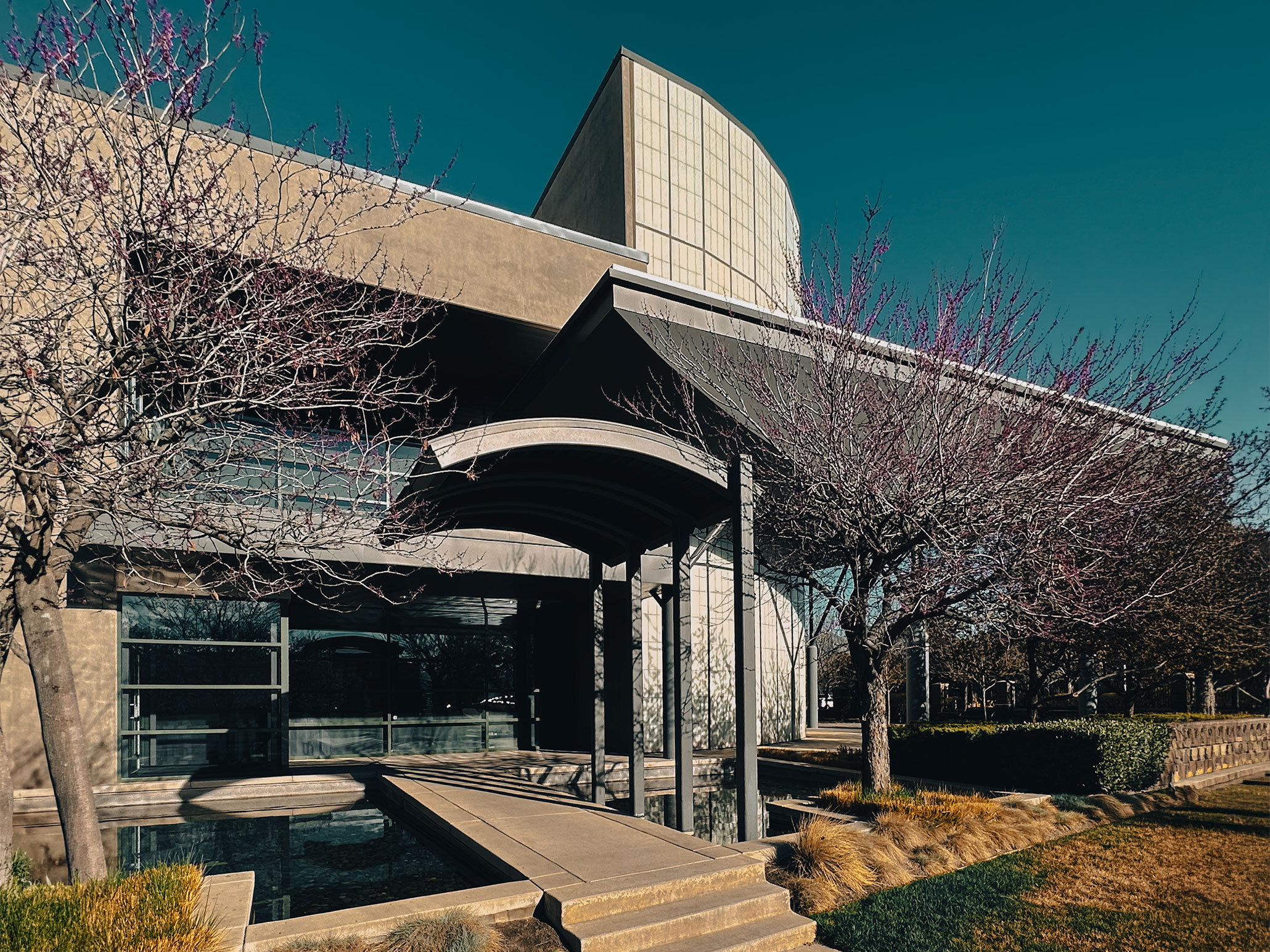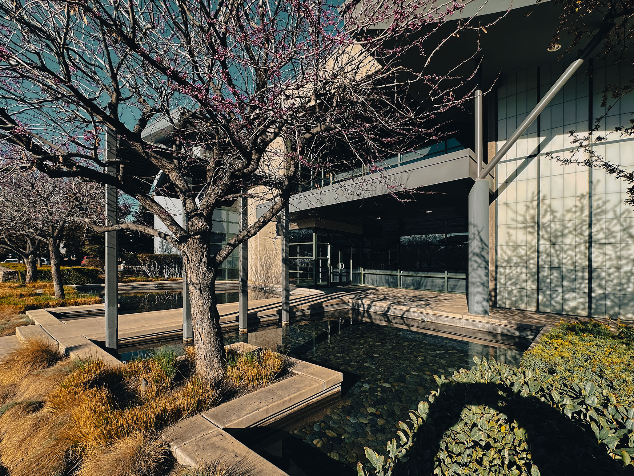 Reflecting pool and entry sequence in current condition, with mature landscaping and updated finishes reinforcing the project’s long-term spatial and material character. Photograph by James Williams, PE, CE, SE, LEED AP, FTCA.