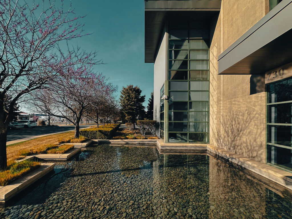 Current condition of the Clyde Companies Corporate Office Building, with mature landscaping, updated color treatments, and areas of re-exposed concrete revealing the original material expression. Photograph by James Williams, PE, CE, SE, LEED AP, FTCA.
