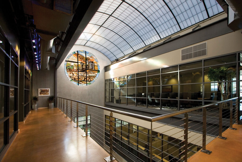 Inside, the building is organized around a 50-foot-tall atrium, bringing daylight deep into the structure through an 18-by-40-foot skylight. Circulation elements—glass stairs, suspended walkways, and a bridge-like entry—reinforce the openness of the space while maintaining the structural clarity of the exposed concrete system.
