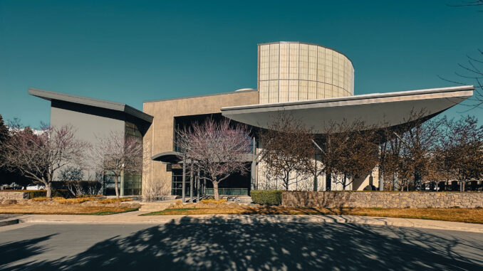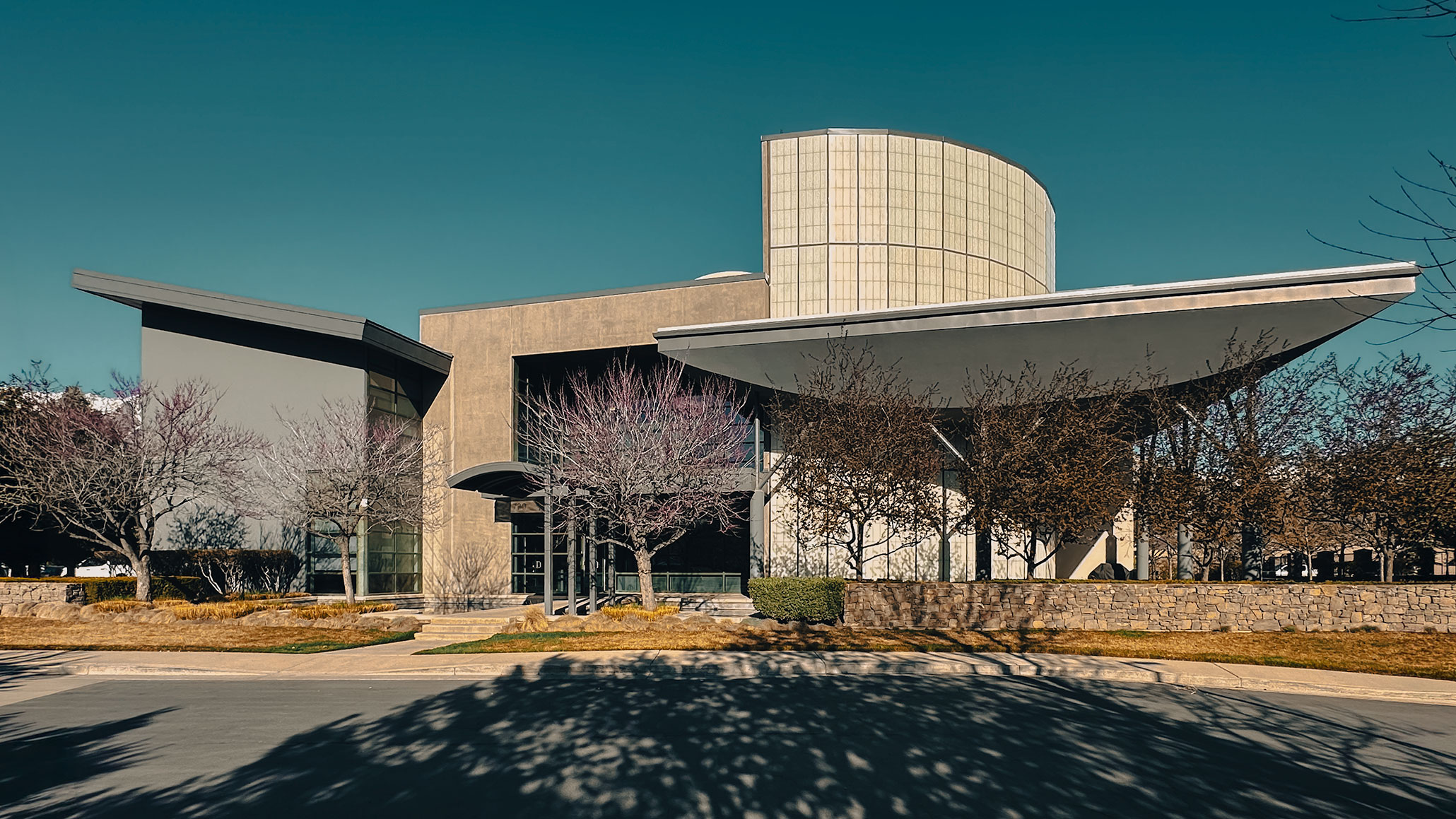 Current condition of the Clyde Companies Corporate Office Building, with mature landscaping, updated color treatments, and areas of re-exposed concrete revealing the original material expression. Photograph by James Williams, PE, CE, SE, LEED AP, FTCA.