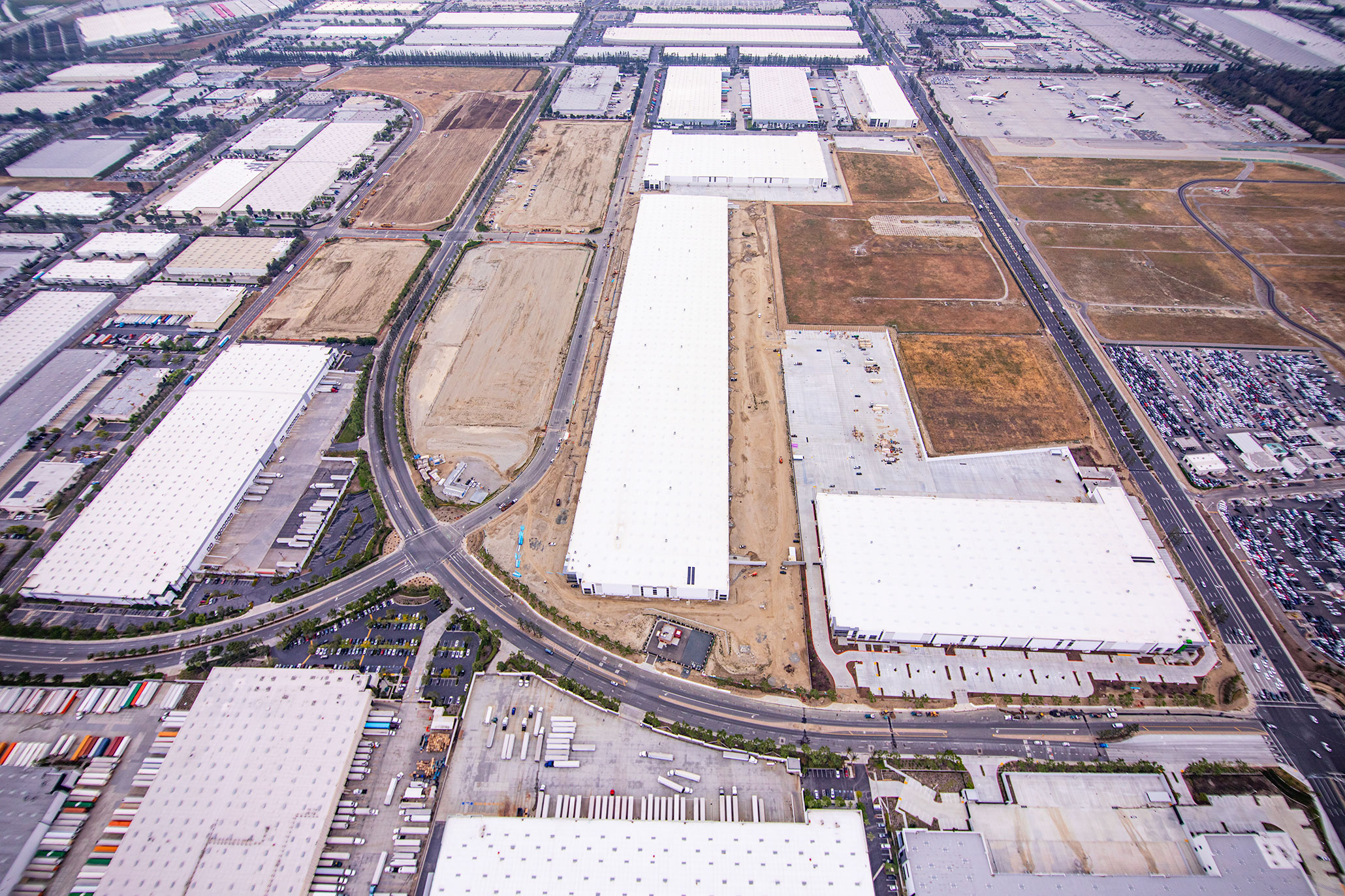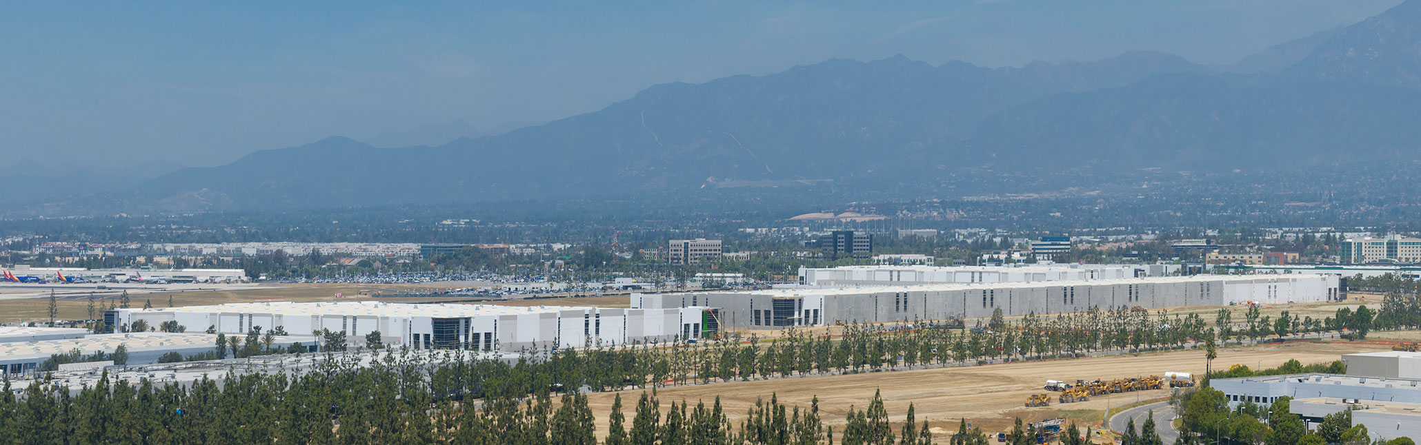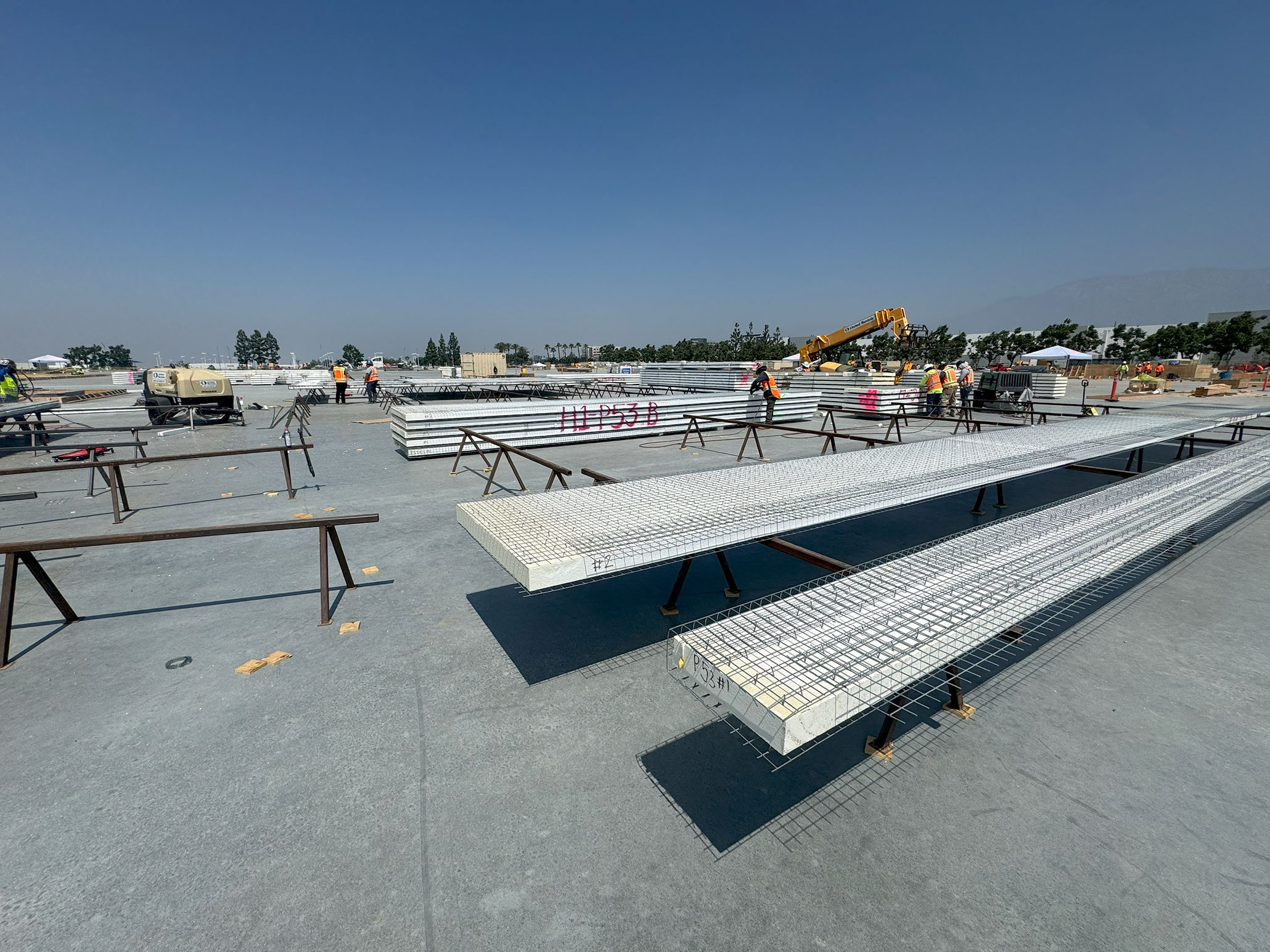 Slab work and panel erection for four buildings—more than two million square feet—were completed within five months. The site’s proximity to Ontario International Airport required close coordination with airport operations, including temporary runway closures during crane activity.