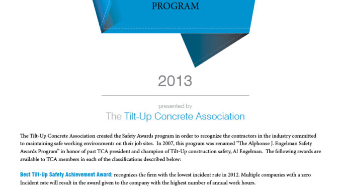 The Tilt-Up Concrete Association (TCA) – the global authority for the tilt-up industry – has announced the call for entries for the 2013 Alphonse J. Engelman Safety Awards. The Tilt-Up Concrete Association created the Safety Read more…
