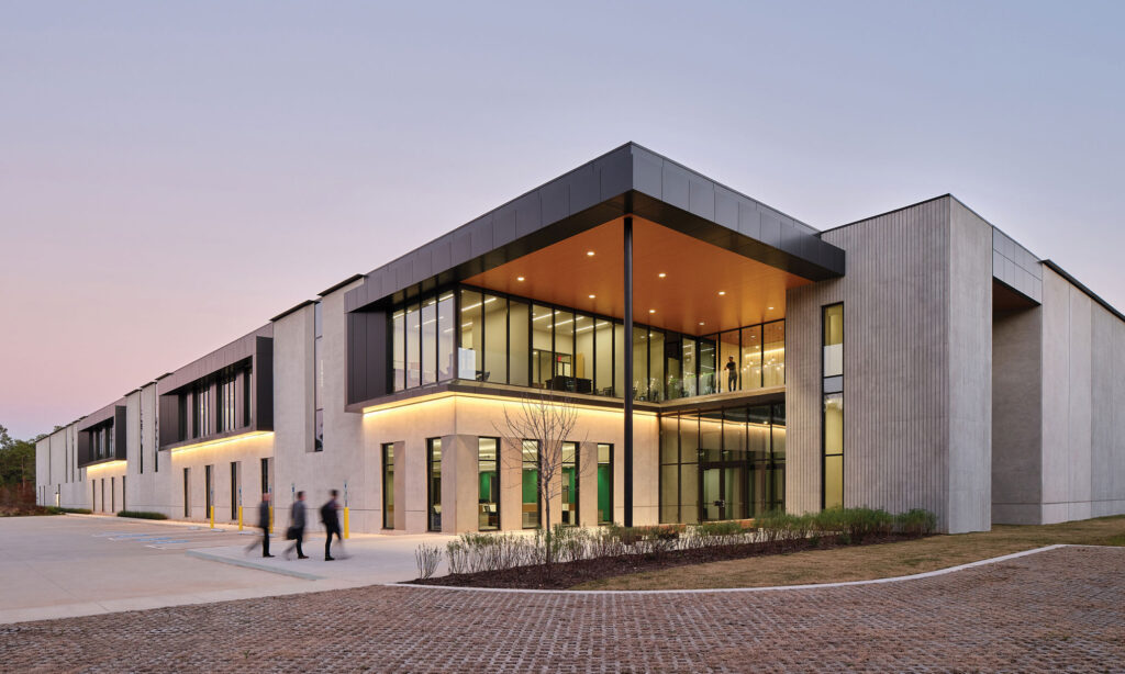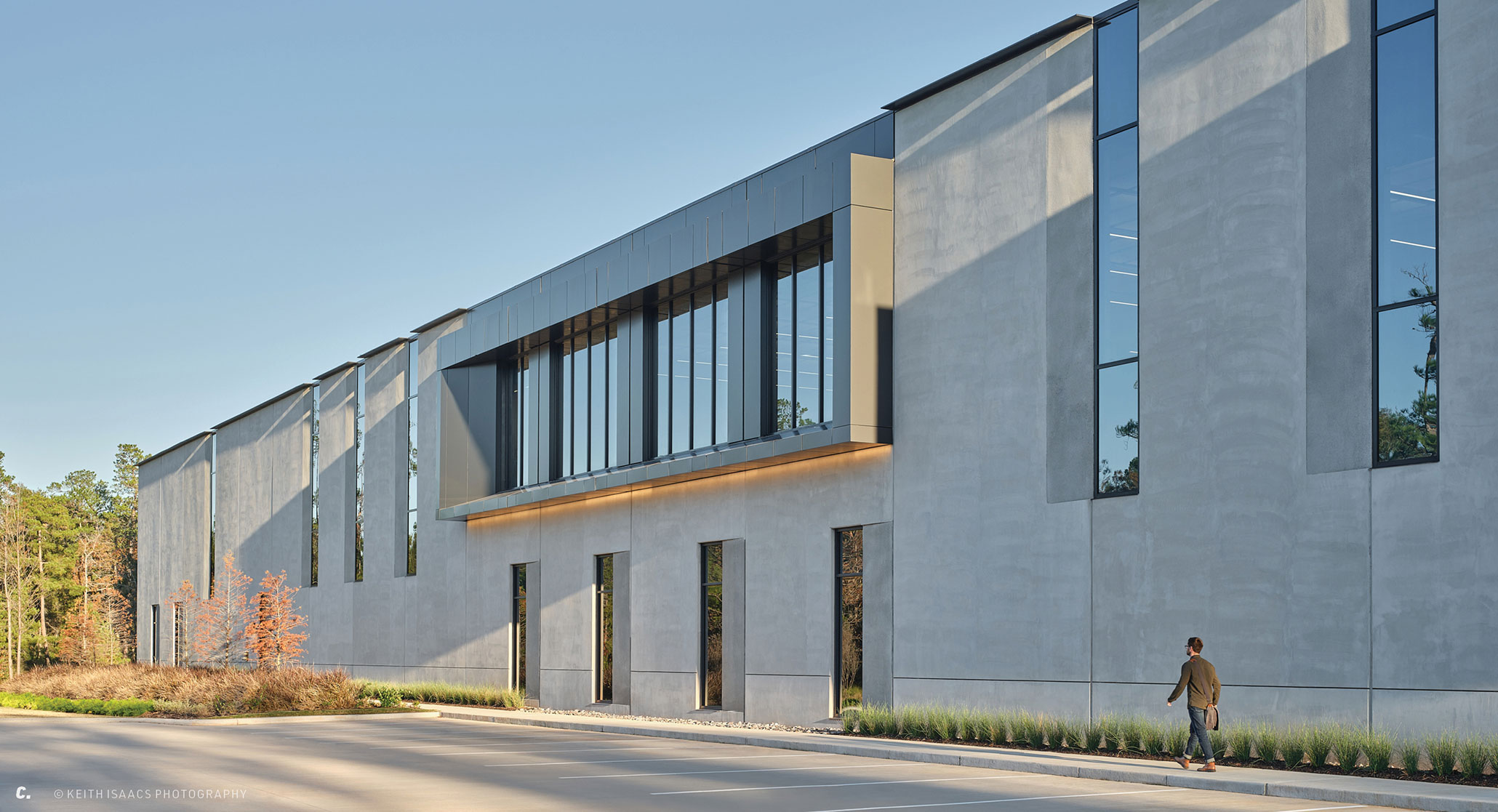 Ubicada en un terreno de 20 acres dentro de un emergente parque de investigación y tecnología, la instalación fue planificada para satisfacer tanto las necesidades operativas inmediatas como la expansión futura. El uso de paneles prefabricados de concreto vertido en sitio como unidades modulares estableció un marco alineado con la naturaleza repetitiva y altamente controlada de los entornos de laboratorio y fabricación. En lugar de introducir complejidad a través de la variación en la geometría de los paneles, el diseño se basó en una familia limitada de tipos de paneles que podían repetirse y ajustarse para lograr tanto rendimiento como interés visual.
